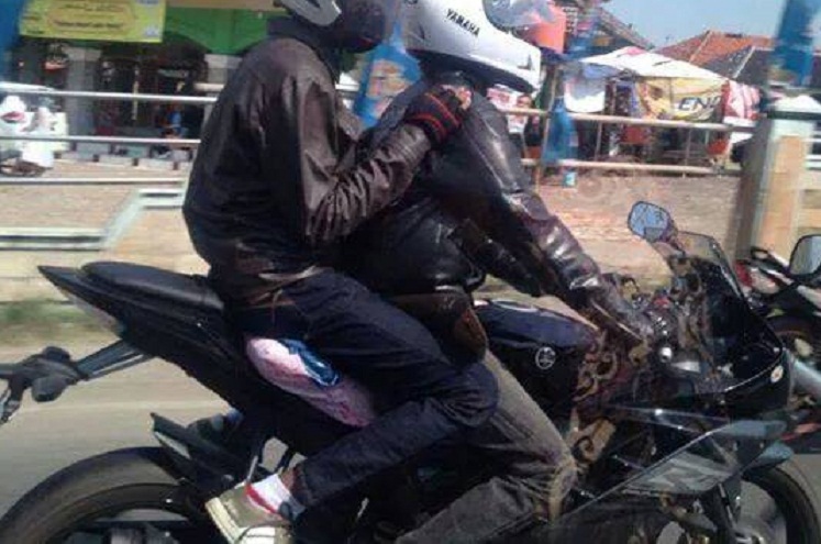 Lah sekarang R15, kalo boncenger duduk tegak wis to kaya antena.. paling tinggi di jalan, kalo mau nempel dikira Maho (kalo boncenger Cowok)..