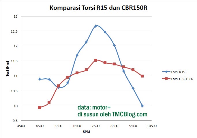 Dari data ini menunjukkan bahwa saat mesin mencapai 9000 rpm, baik power maupun torsi allnew cbr15o mulai mengungguli r15. Dan selsihnya terus manjauh sampai di atas 10600 rpm, artinya akselarasi di rpm rendah sampai 9000 rpm R15 unggul, kemudian lewat dari 9000 rpm cbr150 berbalik unggul. Hasil ini cocok/akur dengan hasil pengetesan motor plus, tapi bertolak belakang dengan hasil pengetesan otomotif.