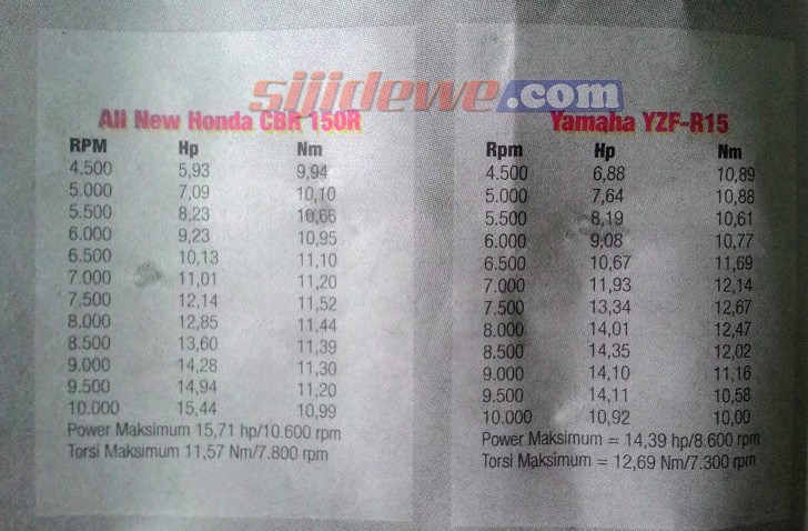 Dari data ini menunjukkan bahwa saat mesin mencapai 9000 rpm, baik power maupun torsi allnew cbr15o mulai mengungguli r15. Dan selsihnya terus manjauh sampai di atas 10600 rpm, artinya akselarasi di rpm rendah sampai 9000 rpm R15 unggul, kemudian lewat dari 9000 rpm cbr150 berbalik unggul. Hasil ini cocok/akur dengan hasil pengetesan motor plus, tapi bertolak belakang dengan hasil pengetesan otomotif.