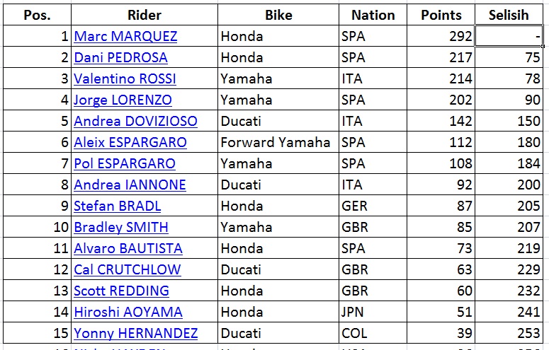 Meskipun demikian klasemen tersebut masih akan menyedot perhatian penggemar motogp untuk tetap nonton balapan, dengan harapan dp-vr-jl bisa mengambil poin maksimum sementara mm crash, kalau bisa nggak balapan sampai akhir. Harapan inilah yang akan menjaga rating dari tontonan hiburan motogp.