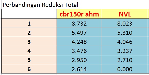 Jika diperhatikan rasio transmisi di atas, rasio transmisi cbr150 lebih ringan. Rupanya AHM ingin mengakali rasio ahir yang lebih berat serta ban yang lebih besar, agar akselerasinya tidak terlalu lemot. Sehingga reduksi total/ahir dari cbr150 menjadi lebih ringan jika dibandingkan dengan nvl.