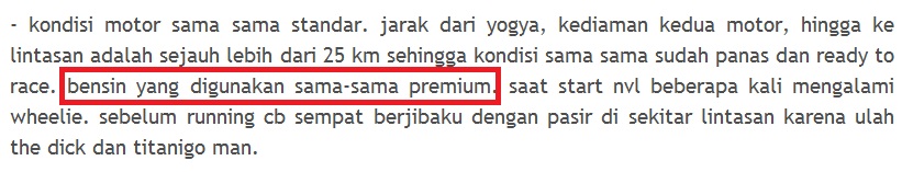 Disalah satu paragrafnya bro nbsusanto menginformasikan bahwa kedua motor tersebut, nvl dan cb150r, diberi bahan bakar “premium”.