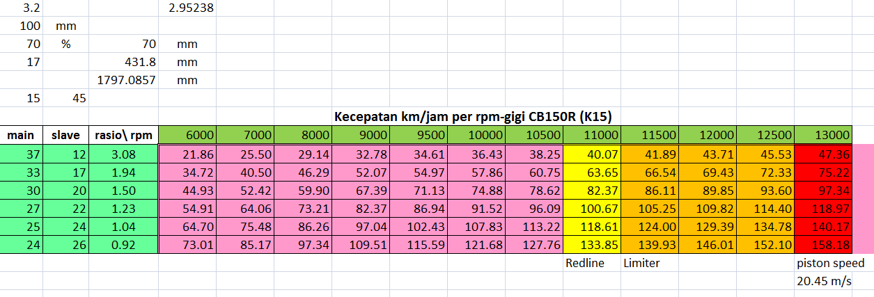 Jika puncak torsi cb150r ada di 8000 rpm, maka setelah itu cbr150 lokal akan mulai menyusul, karena pwr-nya lebih unggul. Sekarang mari kita lihat potensi topspeed setiap percepatan dan rpm-nya