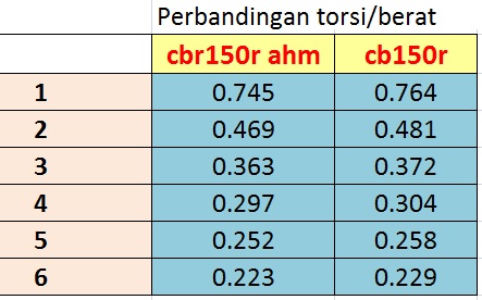 Dari reduksi total ini memang terlihat cb150r (k15) lebih besar alias lebih ringan, dan akan sangat mumpuni untuk berakselerasi. Tetapi karena untuk berakselerasi bukan hanya reduksi yang menentukan, akan tetapi besarnya torsi dan power serta sifat aerodinamika motor, maka sekarang mari kita lihat power/weight dan torque/weight dari k45 dan k15 ini