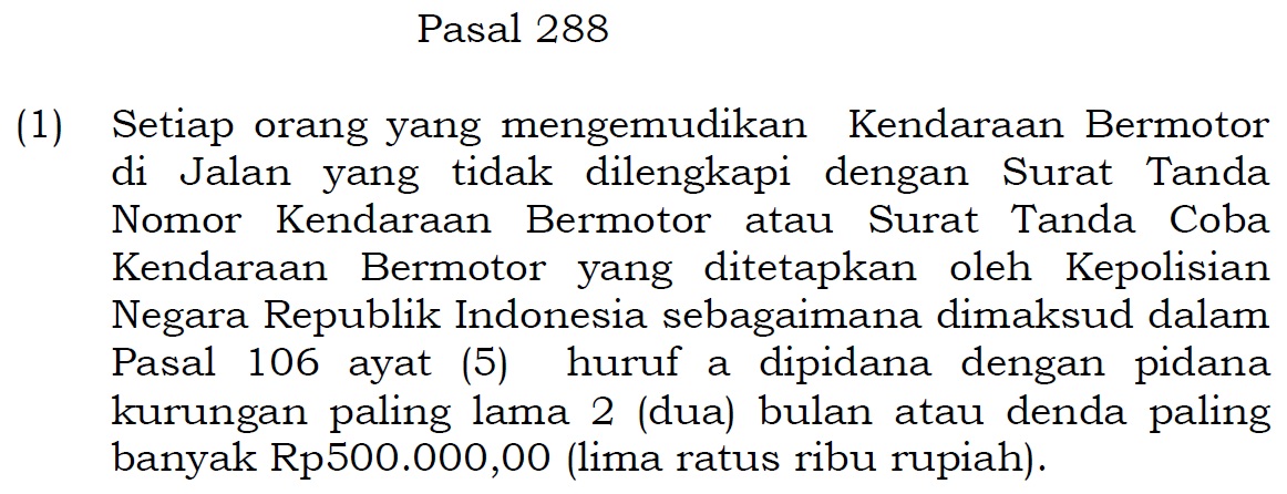 [ASK] tadi ane jalan sama temen 3 motor, ketemu razia di daerah pasar rebo . temen ane kena dengan alasan pajak mati, di surat tilang tertulis pelanggaran pasal 288(1) . ane search google pasal itu bunyinya tidak membawa STNK .