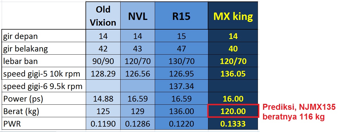 Menurut analisis ane, Dengan power 16 ps dan bobot yang lebih ringan, kemungkinan besar reduksi ahir dari mx king lebih berat dari pada nvl. Akan tetapi karena bobotnya akan lebih berat dibandingkan dengan new jupiter mx 135, maka reduksi akhirnya akan lebih ringan dibandingkan njmx135. Jika perbandingan gir belakang/depan NVL adalah 43/14, dan mx135 adalah 38/14, maka kemungkinan perbandingan gir mx king adalah 40/14.