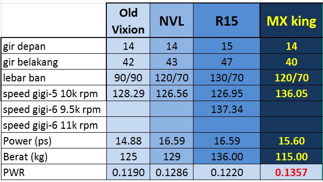Coba perhatikan tabel di bawah ini, meskipun power mx king ternyata nggak sampai 16 ps, akan tetapi bobotnya juga nggak sampai 120 kg, sehingga perbandingan pwr-nya dengan motor bermesin vixion lainnya adalah seperti ini