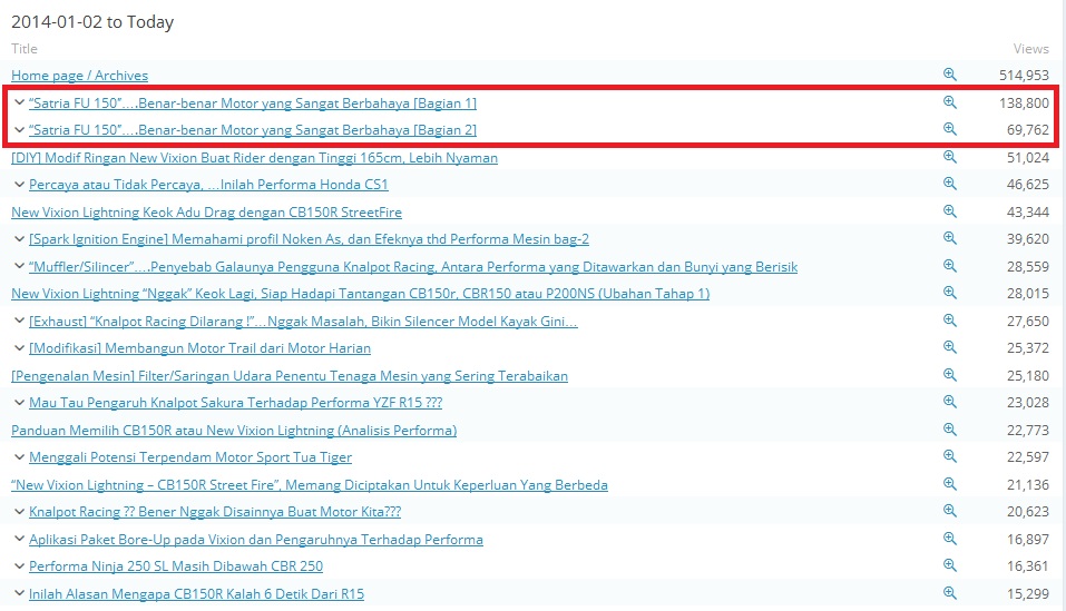 Ddan ternyata dalam statistik pengunjung yang singgah di motogokil.com, 2 artikel mengenai satria fu menjadi pemuncak pertama dan kedua. Cocok kan ..