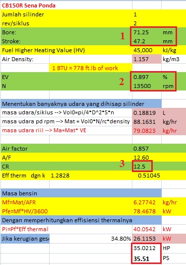 - Efisiensinya cuma naik 9.7% dari kondisi standar yang sekitar 80% menjadi 89.7%. Sedangkan power puncaknya bukan diletakkan di 20000 rpm, tapi cukup di 13500 rpm. Sedikit diatas piston speed maksimum cb150r di 13300 rpm
