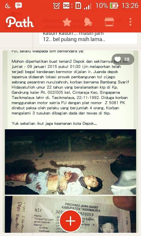 Innalillahi wa inna ilaihi roo ji’uun, baru saja terjadi (malam jum’at tadi) pembegalan sehingga korbannya tewas. Kejadian di Depok, tepatnya disini