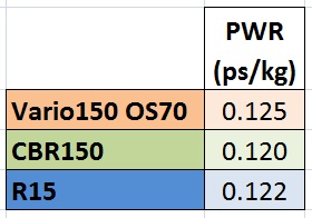 Dari data ini juga menunjukkan adanya potensi, bahwa jika blok silinder dan isinya (piston+ring piston) diganti dengan miliknya pcx150 (oversize 70), maka powernya akan melonjak melebihi power pcx150 atau di atas 13.6 ps (nanti dibahas di artikel berikutnya). Sehingga dengan bobbot yang cuma 109 kp, maka pwr nya bisa mencapai 0.125 ps/kg. Dengan pwr sebesar ini maka vario150 os70 akan melesat lebih cepat dibandingkan cbr150 dan r15, inilah tabel perbandingan pwr-nya