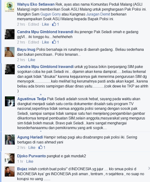 Di Kota Malang ada seorang polisi yang terkenal baik, berbudi (walaupun namanya bukan “budi”) dan profesional. Namanya Pak Seladi anggota Satlantas Polresta Malang. Kebaikan hatinya dan kejujurannya sudah terkenal di seantero Malang, terutama bagi orang-orang yang pernah berinteraaksi dengannya. Berikut ini beberapa testimoni dari orang-orang yang pernah mengenalnya…