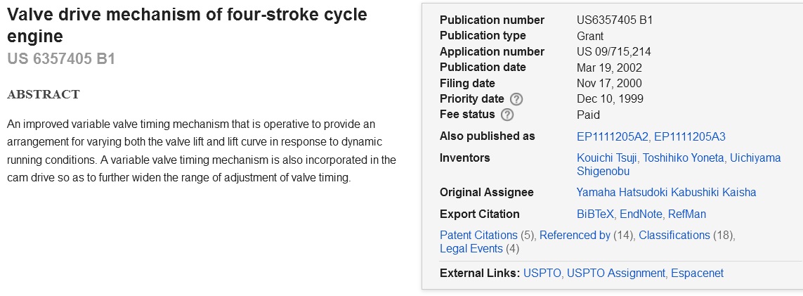 Mengenai Hak Patent, “Patent VVA DOHC” yang anda tulis dalam artikel adalah hak patent no. US 6357405 B1 tentang klaim dari cara kerja Aktuator VVA. disana ada 11 point yang menjelaskan prinsip VVA yamaha yang meliputi rocker arm, servo dan camshaft dan diklaim yamaha sebagai patentnya. Ini merupakan patent DASAR/PERTAMA.
