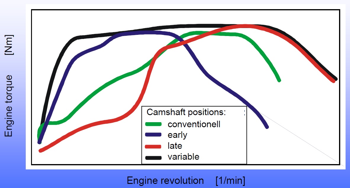Garis hijau adalah kurva torsi dengan menggunakan camshaft konvensional yang mana bentuk dan fasa dari camshaft nya fix, tidak berubah terhadap putaran engine. Jika overlap diperkecil maka torsi di putaran rendah meningkat tapi di putaran tinggi menurun. Tapi sebaliknya jika overlap diperbesar maka torsi di putaran rendah turun dan di putaran tinggi meningkat.