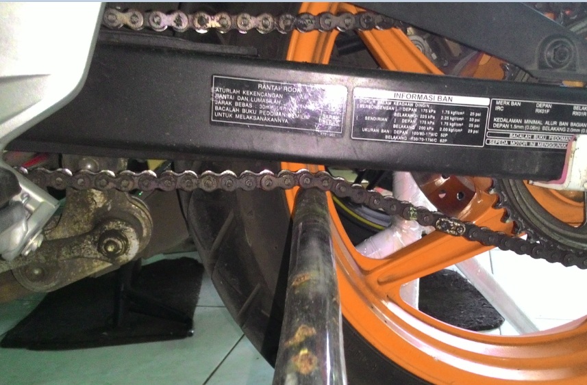 Ternyata kekuatan rantai cbr150 mirip dengan nvl. Setelah kemarin dihajar dengan touring jarak dekat, walaupun belum 2000 km (sejak turun dari diler) kekendurang rantai sudah melewati batas. Kondisi ini jika tidak segera diatasi akan sangat fatal akibatnya. Mulai dari merusak gir, rantai putus, crankcase retak bahkan kecelakaan. Cara mengatasinya sangat mudah, yaitu dengan mengatur kekecangan/tegangan rantai.