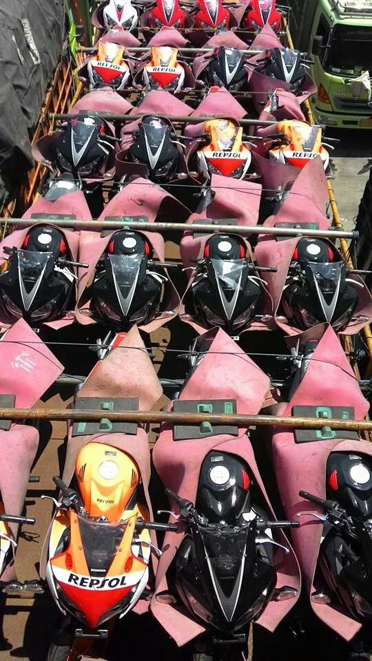 motor mahal & motor sangat mahal di gambar itu motor impor baru dikeluarin dari kontainer ke pabrik/gudang, yang murah sama sedengan motor lokal mau dikirim ke dealer ya naik truk dan ditutup seadanya,