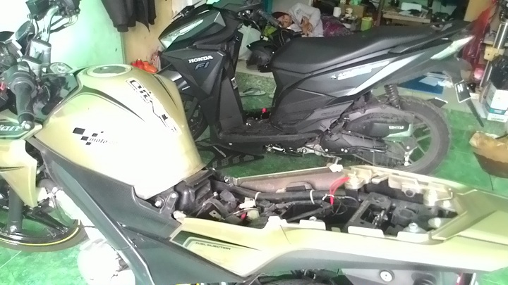 Begitu dateng, langsung aki vario150 ane bongkar (copot), kemudian vario150 di kick-starter, dan….grenggg, nyala bro.