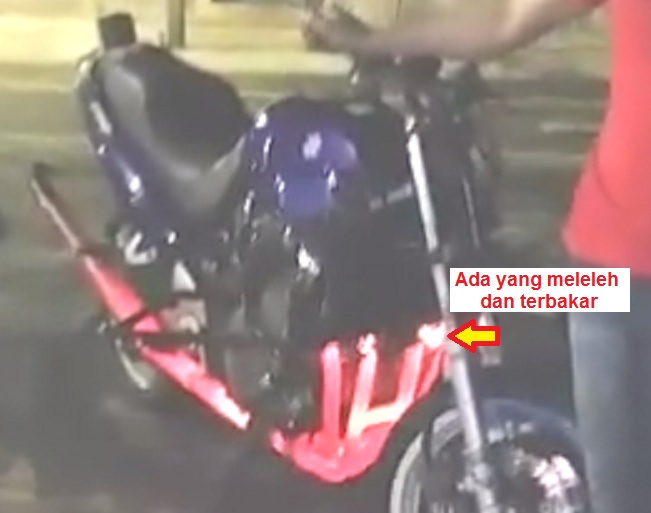 Itulah efek dari menghidupkan motor high performance dalam putaran tinggi tanpa pendinginan yang mencukupi. Tapi memang sebenernya itulah yang ingin ditampilkan dari acara “pamer” motor tersebut. Memperlihatkan knalpot yang membara tanpa mengetahui akibat buruk yang akan terjadi.