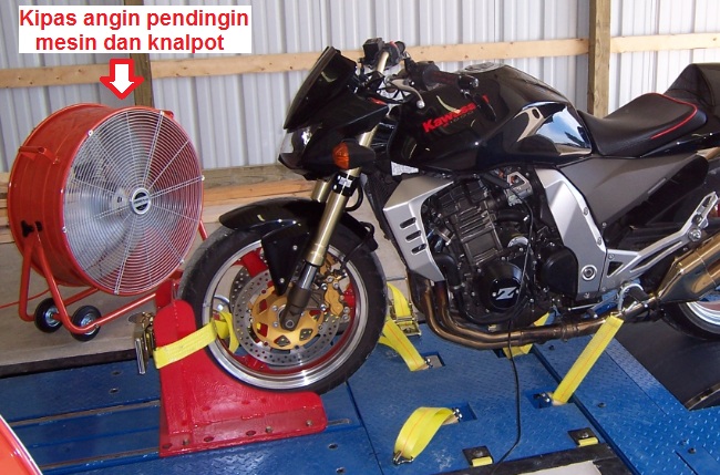 Yang paling baik kalau ingin menguji performa maksimum dari engine sepeda motor dalam kondisi diam adalah dengan memberikan pendinginan udara yang mengalir. Sebagai simulasi seperti saat di jalan raya. Semakin tinggi rpm, seharusnya kipas angin berputar semakin kencang. Begitupuan dengan semakin tinggi powernya, semakin besar kipasnya. Seperti yang biasa dilihat di pengujian motor di atas mesin dyno.