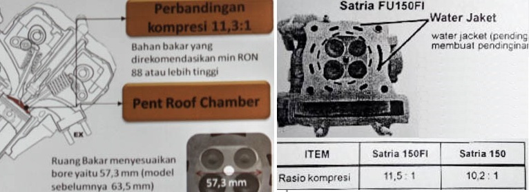 Sesungguhnya dengan konstruksi yang berbeda tersebut, bisa saja performanya seimbang (seperti komparasi satria fu 150 versi karbu vs sonic150r). Akan tetapi ternyata performa satria fu150fi lebih superior dibandingkan sonic150r. Nah sekarang mari kita periksa beberapa detil dari jeroan engine (ruang bakar/combustion chamber) satria fu150fi dan juga sonic150r sebagai penghasil tenaganya.