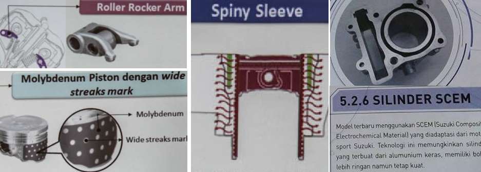 kenapa suzuki tdk pasang spiny sleeve, karena dg SCEM selain anti friksi jg penghantar panas yg bagus dibandingkan steel sleeve, jadi scem diimbangi oleh honda dg 2 pendekatan, piston anti friksi dg spiny sleeve…..