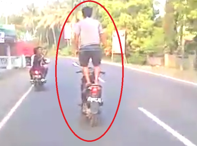 Pastinya adegan ini sangat berbahaya dan membutuhkan keahlian khusus. Melihat apa yang dilakukan biker ini, jelas sekali ilegalnya juga melanggar undang-undang lalulintas. Tidak pakai helm, berdiri di atas sadel, membahayakan dirinya dan juga orang lain. Mungkin biker ini sedang bersenang-senang, membayangkan sedang beselancar (entah di mana).