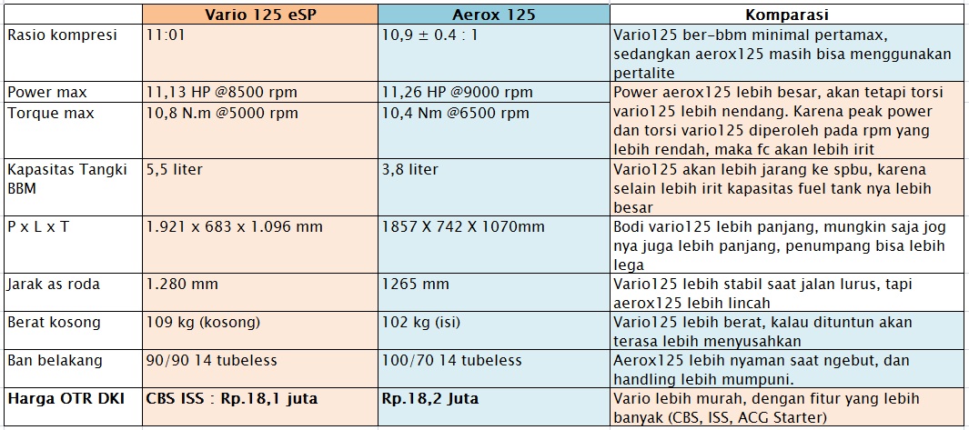 Jadi masing-masing memiliki kelebihan dan kekurangan. Tinggal calon pembeli mempertimbangkan mana yang dianggap penting, diberi bobot yang lebih besar. Jika mementingkan performa secukupnya dengan tingkat efisiensi yang lebih tinggi, serta lebih murah maka vario125 bisa dijadikan pilihan utama. Tapi jika ingin skutik yang lebih kencang serta handling yang mumpuni, maka pilihan yang lebih tepat ada pada aerox125.