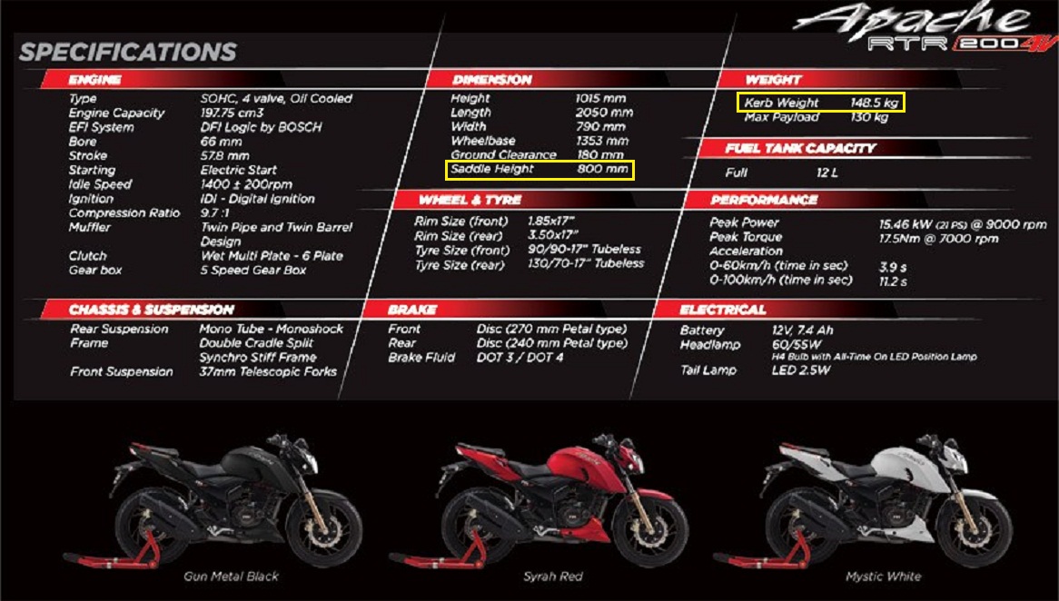 3 variabel spesifikasi rtr 200 ini lebih besar dibandingkan rival-rivalnya. Dan hal ini sangat menyulitkan kebanyakan rider di Indonesia, yang rata-rata memiliki postur yang lebih kecil dibandingkan rider india. Kondisi ini mirip dengan motor india lainnya yang dimasukkan ke Indonesia secara utuh, tanpa modifikasi yang disesuaikan postur rider di Indonesia.