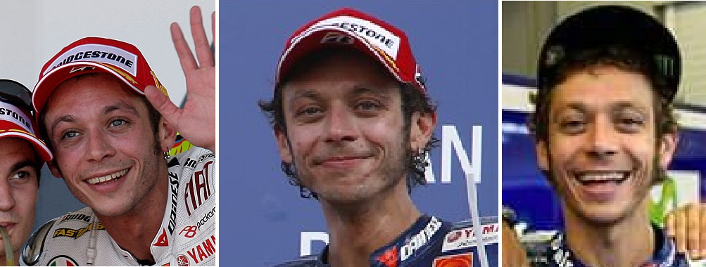 Terlihat senyumnya tidak lepas, alias terpaksa. Bandingkan dengan gambar-gambar ketika rossi sedang gembira, seperti gambar ini