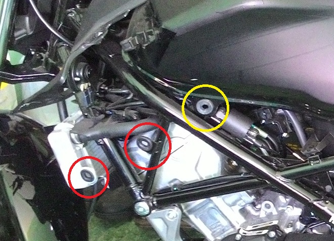 Pelepasan/pencopotan shroud ini diperlukan ketika akan melakukan pengangkatan tangki, atau modifikasi pada kunci kontak. Karena baut penguncinya ada di bawah cover depan tangki. Berikut ini penampakan baut pengunci tangki bensin dan kunci kontak.