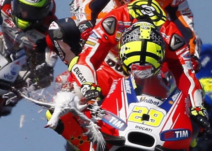 Tentunya pencinta motogp, apalagi fans nya Andrea Iannone, masih ingat kejadian australian motogp 2015. Saat itu terjadi insiden, seekor burung camar tertabrak oleh motor ducati gp15 iannone. Begitu kencang tabrakan sehingga burung camar tewas di tempat, sementara fairing gp15 bolong.