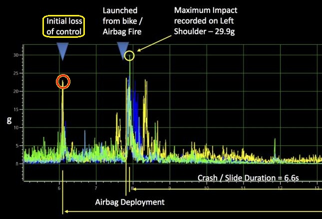 Jadi ketika akselerasi rider tiba-tiba melonjak luarbiasa besar dalam waktu yang sangat singkat, (lihat gambar, mencapai 23 G). Kemudian beberapa saat  sebelum rider crash airbag telah mengembang sempurna untuk memberi proteksi bagi sang rider. Mengenai delay waktu antara trigger dan airbag mulai mengembang, motogokil belum tahu harus berapa detik, jika lihat gambar sekitar 1.7 detik. Mungkin saja ada pentrigger lain, atau sudah ditentukan berdasarkan statistik rider saat crash.