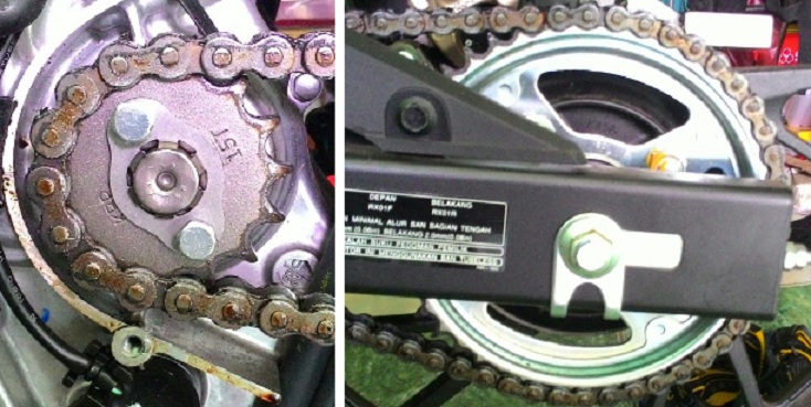 Sedangkan perawatan yang kurang, sering menjangkiti rider, yang hanya bisa memakai, tanpa bisa merawat. Karena kondisi pelumasan rantai harus dipantau secara berkala. Jika kurang/kering harus ditambah. Baik dengan oli, stemvet ataupun chainlube. Jika tidak rantai akan cepat kering, berisik, berkarat dan aus. Mengenai cara merawat rantai, bisa merujuk ke artikel sebelumnya di sini [1,2]