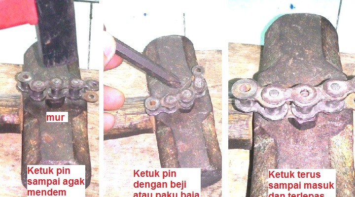 2. kalo saya kondisi rante masih menancap di gir, lalu bagian dekat sambungan yg mau dipotong dipahat pelan2 pake obeng minus ato pahat kayu (kebetulan dirumah ada). kalo dibaringin gitu rantenya suka kemana2.