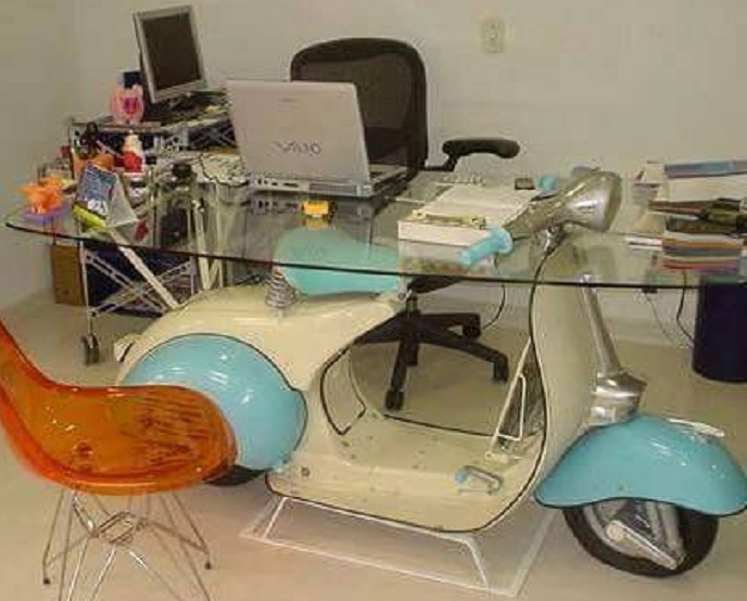 Kalau memang ada motor yang seperti itu, apalagi bro n sis telah memproklamirkan sebagai biker sejati, maka motor kayak gitu masih bisa dimanfaatkan. Misalnya mejadi kaki meja kerja kita sehari-hari. Lihat nih salah satu penampakannya…
