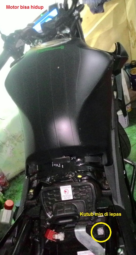 Langkah percobaannya adalah, copot kutub negatif aki, kontak posisikan “on”. Selanjutnya coba motor dihidupkan dengan kick starter. Setelah beberpakali mencoba, yakin sudah bahwa engine satria fu 150 fi tidak bisa dihidupkan jika aki mati/dilepas.