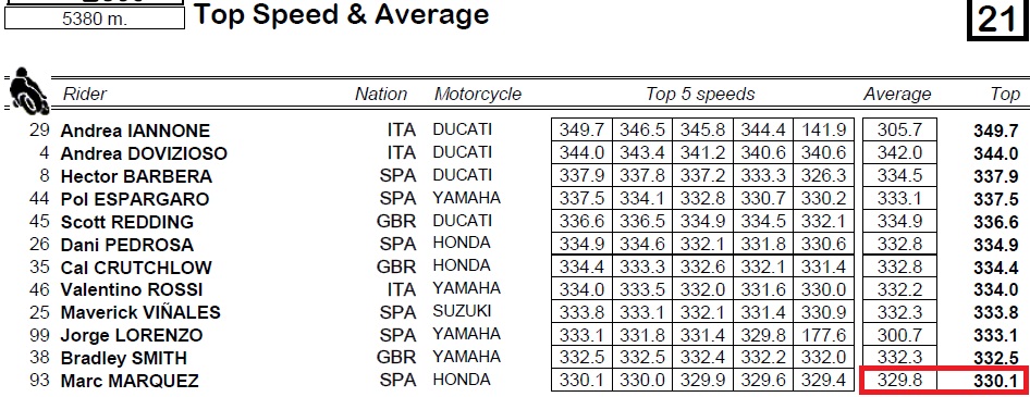 Kenyataannya yang biasa tercepat di qatar memang jl99, sedangkan mm93 lumayan bisa dibelakangnya. Akan tetapi ada yang sedikit mengganjal motogokil, perhatikan topspeed motor rc213v nya mm93, hanya 330.1 kpj, paling rendah diantara semua pembalap. Lihat tabel perolehan topspeed saat kualifikasi
