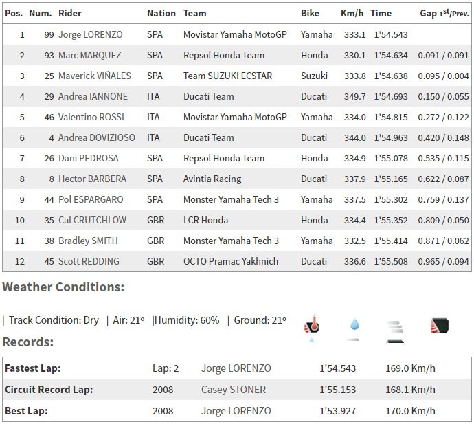 Akan tetapi hasil kualifikasi menunjukkan, “tiba-tiba” mm93 mulai mengeluarkan tajinya. Ia berhasil menyodok di posisi 2 setelah jl99 dengan selisih 0.091 detik. Berikut ini tabel hasil kualifikasi tadi malam…