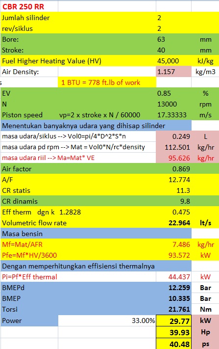 Jika mengacu pada spesifikasi new cb150r yaitu limiter di piston speed sekitar 20.5 m/s dengan CR 11.3:1, peak power diletakkan pada putaran 2500 rpm sebelum limiter (13000 rpm), maka powernya bisa mencapai 40 ps.