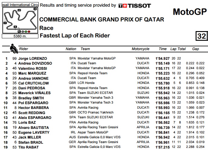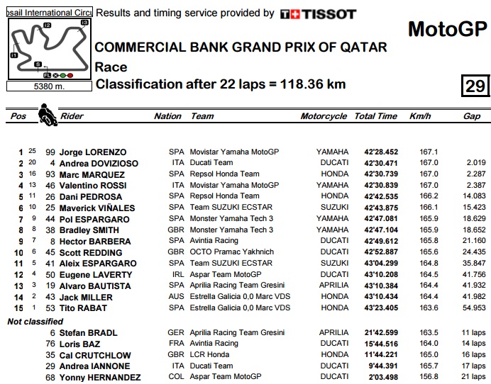 Balapan motogp di qatar telah selesai tadi malam. Balapan berlangsung tanpa greget, biasa-biasa saja. Lorenz0 (jl99) dengan yamaha yzr m1 yang memang sangat kuat dari awal (fp-qty) akhirnya podium-1. Sedangkan ducati yang memang biasanya kuat di qatar juga podium-2. Sedangkan honda yang terseok-seok karena didera masalah ecu, engine liar dan ban, akhirnya mendapat sisa podium-3.
