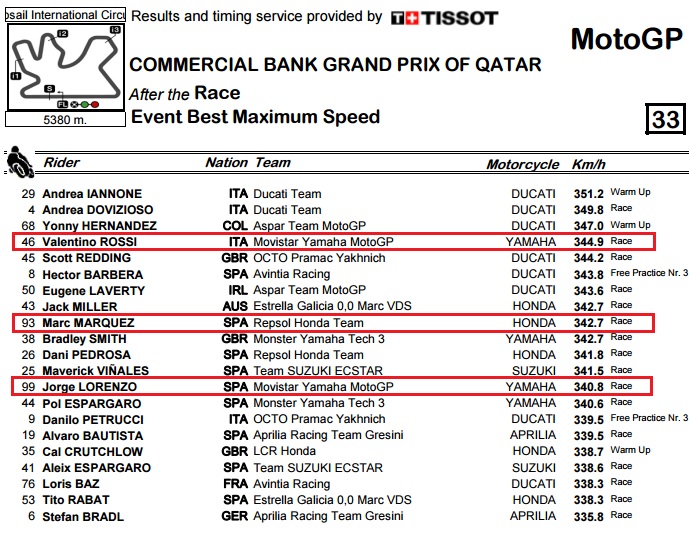 Sepertinya semua hampir sesuai dengan ekpektasi sebahagian besar pengamat motogp, kecuali performa Rossi (vr46). Sewajarnya rossi dengan motor yang identik dengan motor jl99, mampu merangsek ke podium, minimal di bawah jl99 (podium-2). Akan tetapi kenyataannya ia sangat sulit menyusul rider 3 terdepan. Ada apa ya ? Padahal motornya paling kencang dibandingkan jl99 dan mm93 (tapi masih di bawah ad04). Selain itu rossi sudah terkenal sangat piawai melibas tikungan, mengapa sampai akhir tidak mampu menyusul jl99-ad04-mm93. Berikut catatan top speed rider motogp tadi malam.
