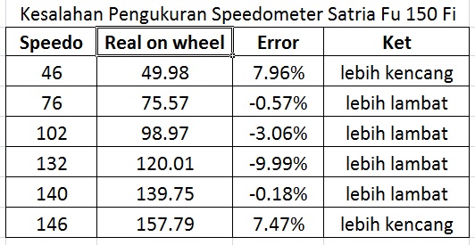 Akan tetapi jika error yang diberikan speedometer sangat besar, juga tidak sip bagi speed-lover. Karena bisa menjadi bahan ejekan bagi rider yang lain, ketika dibandingkan. Untuk mengetahui seberapa besar error angka speedoemeter satria fu 150 fi, lihat perhitungan ini…