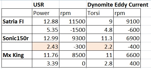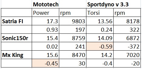 Oleh karena itu, jika ada beberapa hasil pengukuran dyno dan komparasi antara satria fu 150 fi vs sonic150r vs mx king, yang berbeda, maka hal itu wajar adanya. Berikut ini motogokil coba sampaikan beberapa hasil pengukuran yang sempat mebuat heboh dunia maya beberapa hari ini. Pada tabel yang ane sampaikan, juga ane beri tambahan “selisih” dengan pengukuran yang diberikan pabrik masing-masing motor (brosur).
