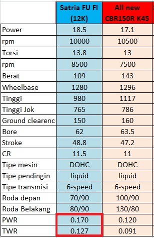 Kalau dilihat jemlegernya (penampakan fisik) perbedaannya sangat jelas, satria fu 150 fi adalah bebek ayam jago, sementara all new cbr150r lokal (k45) adalah motor sport full fairing. Akan tetapi kedua motor beda kelas ini memilki sumber kekuatan yang sama, yaitu engine dengan spek yang mirip :