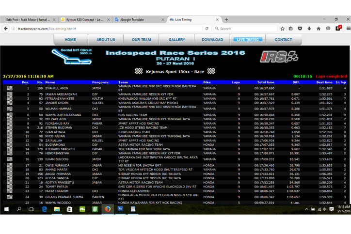 Hari ini selesai sudah pergelaran balap nasional IRS putaran-1 yang digelar di sirkuit internasional sentul. Yamaha dan pendukungnya (fby) sangat senang dan bersukaria, karena behasil mendominasi balapan di kelas sport 150cc dan 250cc, sedangkan honda hanya menguasai kelas 600 cc. Sepertinya dua pabrikan besar, berbeda fokus dalam pengembangan tim balapnya, yamaha untuk sport kecil 150-250 cc, sedangkan honda di sport besar 600 cc.
