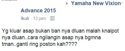 Jawaban dari rekan-rekannya beragam, ada yang serius ada yang bercanda. Akan tetapi semuanya sepertinya sepakat mengenai solusinya yaitu : ganti ring piston dengan miliknya old vixion (3c1). Jadi bagi owner nvl (3pa) dan nva (2pv) jangan meniru gaya di atas, atau harus mau menanggung konsekuensinya. Lebih baik dipakai sewajarnya saja, untuk stransportasi sehari-hari akan lebih awet dan aman.
