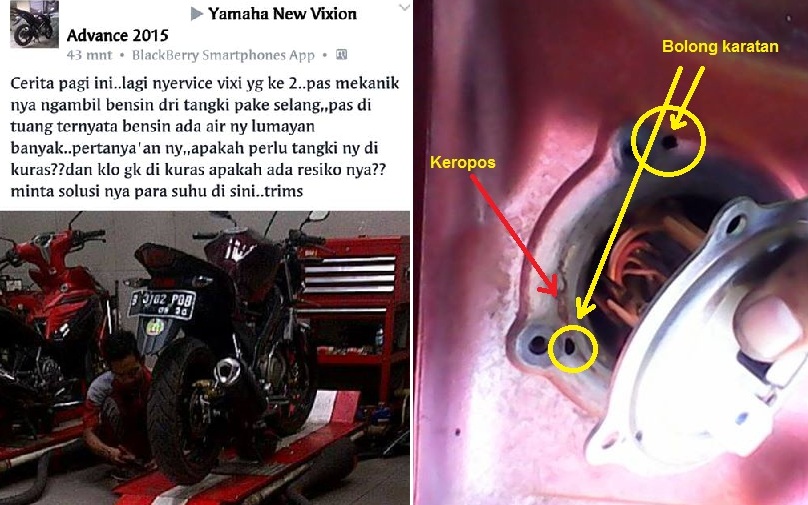 Kejadian di atas sama persis dengan motor saya, memang sampai saat ini juga blm di ketahui pasti air bisa masuk lewat mana, tapi klo kemungkinan besar karna pengisian BBM yg kosong atau setengah, sehingga terjadi penguapan dalam tangki yg mengakibatkan timbul air. Kalau bisa isi BBM full tangki, JANGAN KESERINGAN nunggu kosong/rest baru isi BBM atau ruang tangki kosong setengah pun pengaruh juga buat timbulnya uap yg mengakibatkan air muncul.