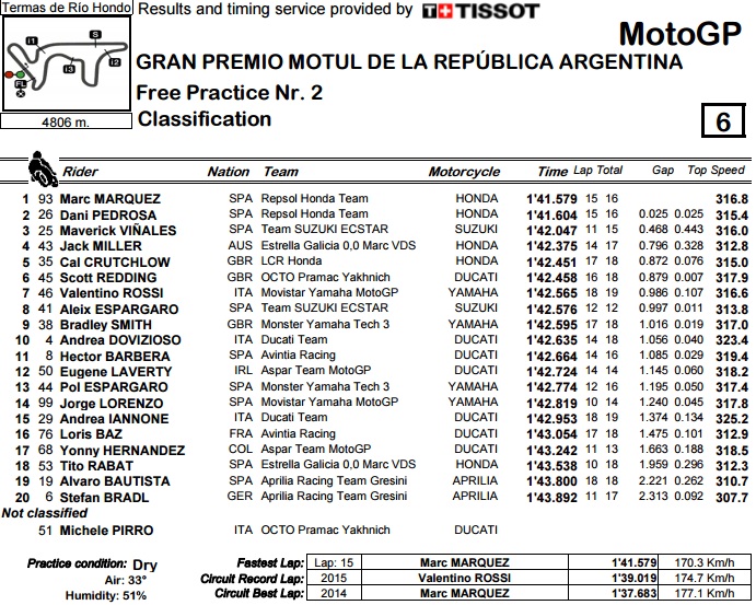 Perhatikan posisi terakhir fp2 di termas rio hondo argentina, di motogp tahun 2016 ini