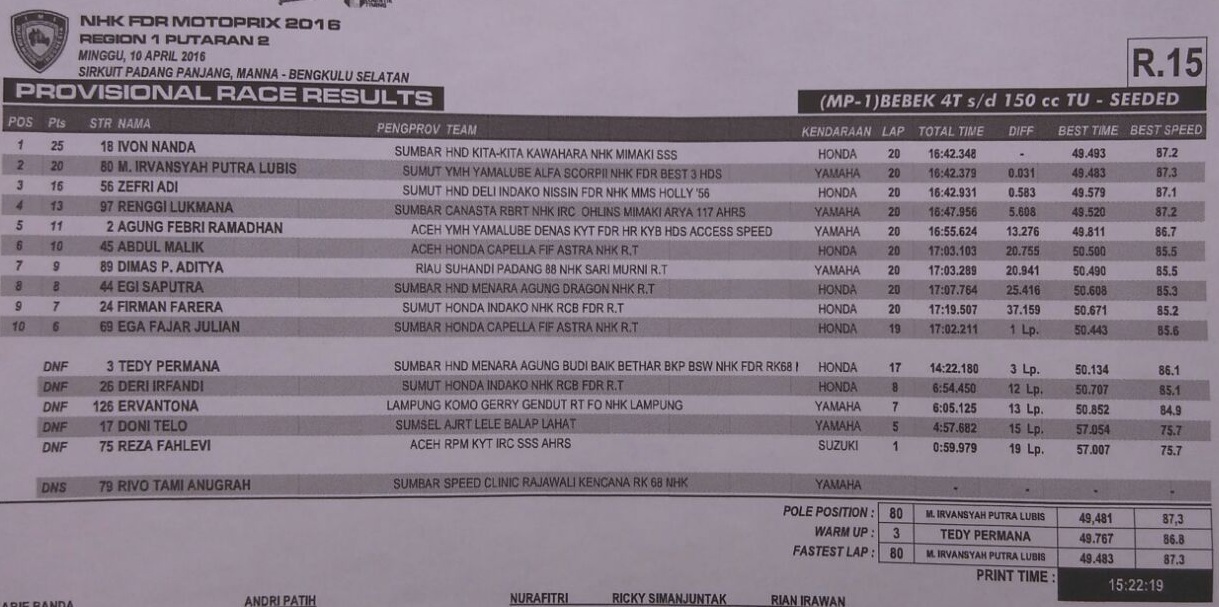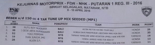 Tapi perlu juga diketahui, bahwa pada mp-1 dirace tersebut, pole position ditempati oleh pembalap honda (sonic150r). Sehingga kekalahan sonic150r pada balapan tersebut, bisa jadi disebabkan oleh faktor pembalap. Selanjutnya jika kita lihat hasil beberpa motorprix region lain, maka sonic150, si engine dohc hello kitty dan klotok-klotok, mulai mengancam posisi mx king. Perhatikan hasil ini