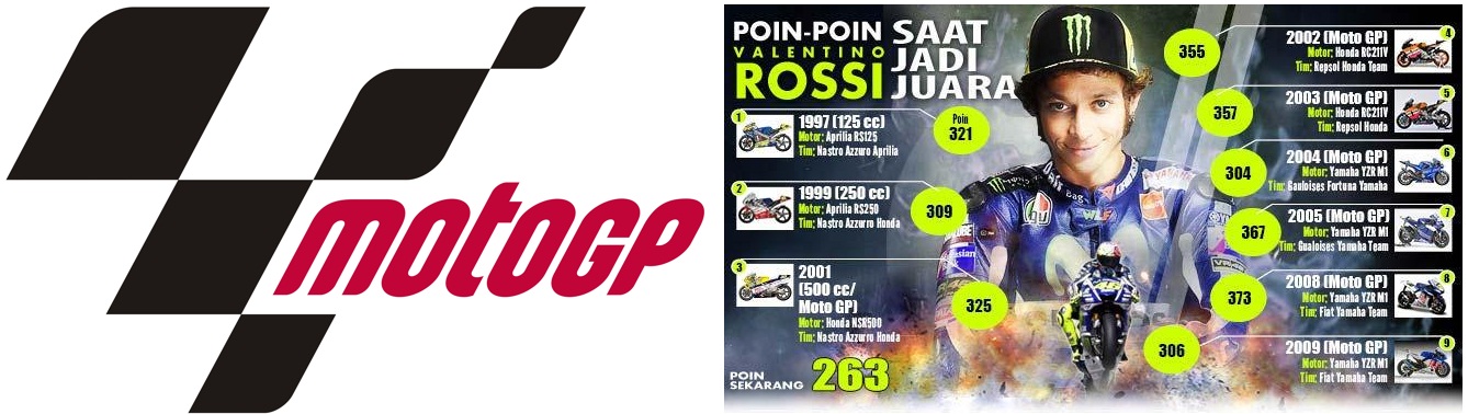 • Semua jaya pada eranya, blm tentu rossi hebat jk seangkatan dg pebalap sbelumnya cobtoh saja era M doohan,,lihat tuh keamanan pebalap, sgt sdikit skali control elektronik…masih ingat M Doohan kaki patah alias habis operasi msh ikut race, bahkan rem belakang dipindah jd rem tangan karena kaki kanan blm bs digerakkan,,,itu aja msh bisa podium 1,,